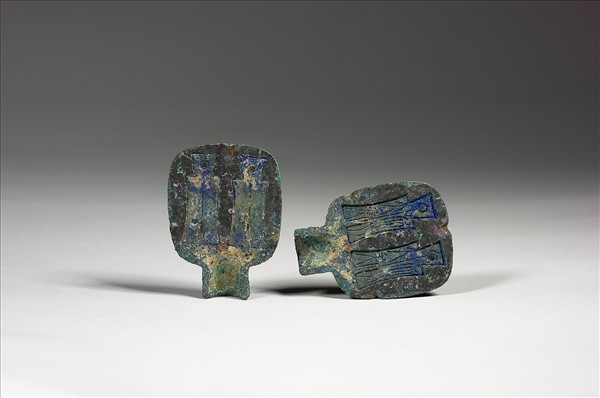 銅錢範,由正反兩塊鉚合而成,為雙合銅範。有管流狀澆口,另一端有角形卡榫。範內面有貨布模兩枚,一側作「大布黃千」陰文,另一側無文。