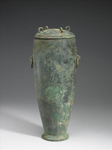 器身為口大底小的深窄腹,圈足。蓋上有四環形鈕及三圈同心弦紋,壺身兩側有獸首銜環耳,器身光素無紋。