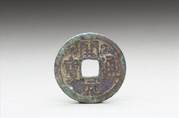 方孔圓錢,正面有楷書:「開元通寶」四字,或以為「開通元寶」四字,背面無文。