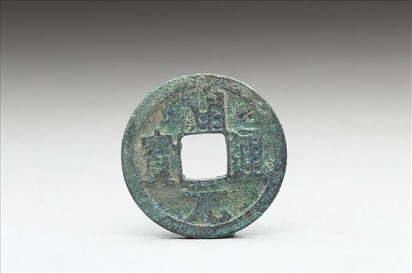 方孔圓錢,正面有楷書:「開元通寶」四字,或以為「開通元寶」四字,背面無文。
