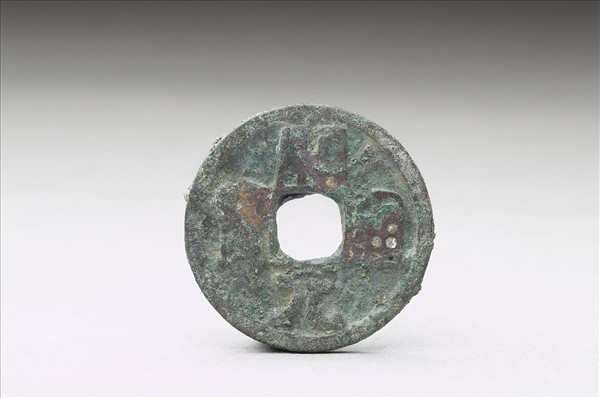 方孔圓錢,正面有楷書:「開元通寶」四字,漫漶不清,或以為「開通元寶」四字,背面無文。