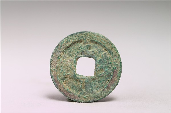 ⽅孔圓錢,正⾯有行書:「元祐通寶」四字,背⾯無文。