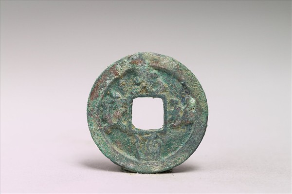⽅孔圓錢,正⾯有行書:「元祐通寶」四字,背⾯無文。