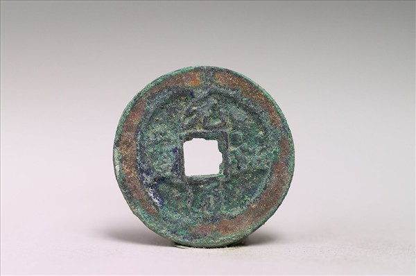 ⽅孔圓錢,正⾯有行書:「元祐通寶」四字,背⾯無文。