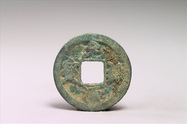 ⽅孔圓錢,正⾯有行書:「元祐通寶」四字,背⾯無文。