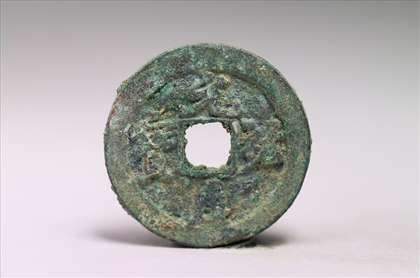 ⽅孔圓錢,正⾯有行書:「元祐通寶」四字,背⾯無文。