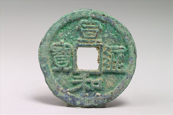 銅質。方孔圓錢,正面有楷書:「宣和通寶」四字,背面無文。