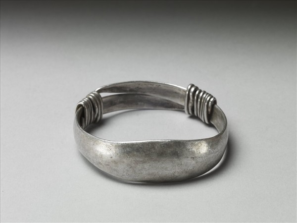 銀銅合金手鐲,全器由一扁平金屬條彎繞成一圓環,兩端漸細,末端交錯成為迴旋纏繞之金屬圈,可調整手鐲大小並兼具裝飾功能。