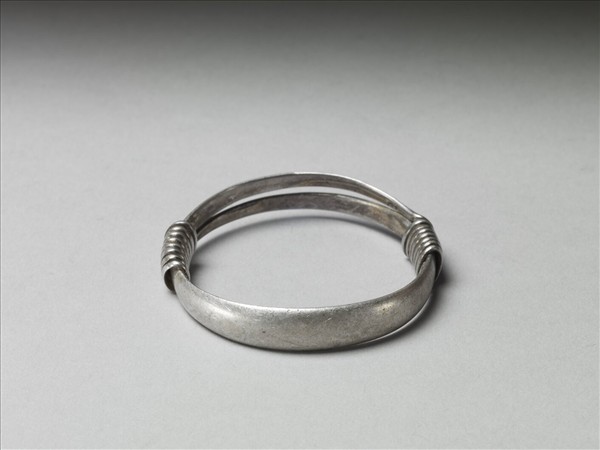 銀銅合金手鐲,全器由一扁平金屬條彎繞成一圓環,兩端漸細,末端交錯成為迴旋纏繞之金屬圈,可調整手鐲大小並兼具裝飾功能,內側有刻款「美中奇」。
