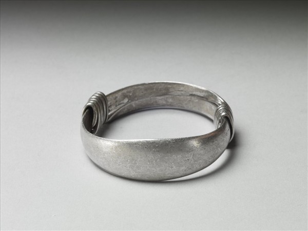銀銅合金手鐲,全器由一扁平金屬條彎繞成一圓環,兩端漸細,末端交錯成為迴旋纏繞之金屬圈,可調整手鐲大小並兼具裝飾功能。