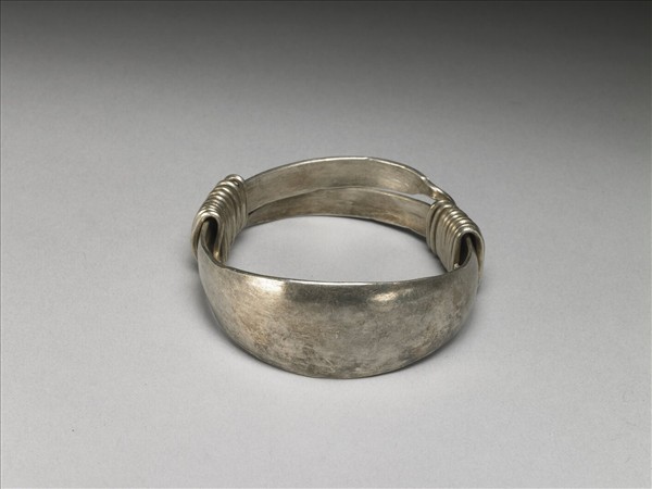 銀銅合金手鐲,全器由一扁平金屬條彎繞成一圓環,兩端漸細,末端交錯成為迴旋纏繞之金屬圈,可調整手鐲大小並兼具裝飾功能。