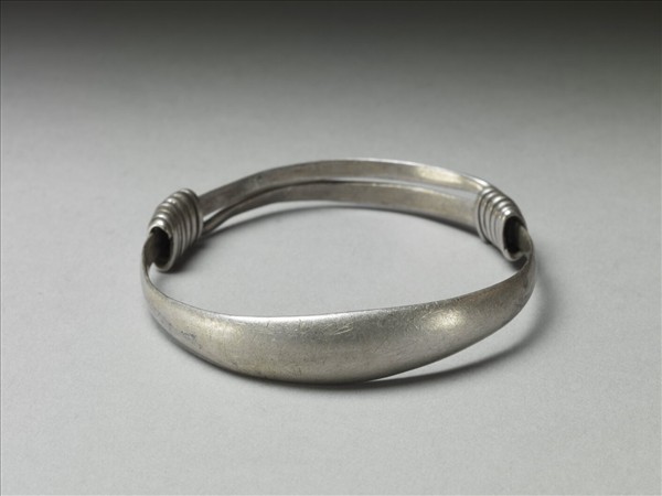 銀銅合金手鐲,全器由一扁平金屬條彎繞成一圓環,兩端漸細,末端交錯成為迴旋纏繞之金屬圈,可調整手鐲大小並兼具裝飾功能。