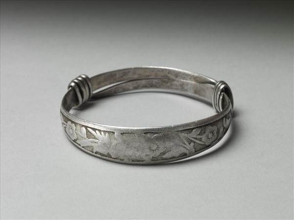 銀銅合金手鐲,正面鏨刻點狀紋錦地梅花紋,全器由一扁平金屬條彎繞成一圓環,兩端漸細,末端交錯成為迴旋纏繞之金屬圈,可調整手鐲大小並兼具裝飾功能。內側有戳記「足銀」。