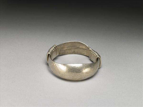 銀銅合金手鐲,全器由一扁平金屬條彎繞成一圓環,兩端漸細,末端皆成為迴旋纏繞之金屬圈,可調整手鐲大小並兼具裝飾功能。