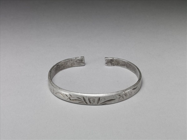 銀銅合金手鐲,全器由一扁平金屬條彎繞成一圓環,帶缺口以供手腕穿戴,外側鏨刻蓮花紋與幾何紋。