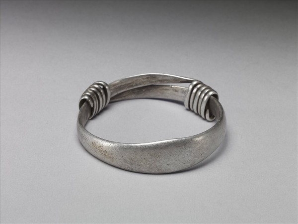 銀銅合金手鐲,全器由一扁平金屬條彎繞成一圓環,兩端漸細,末端皆成為迴旋纏繞之金屬圈,可調整手鐲大小並兼具裝飾功能,內側有刻款,漫漶不清。