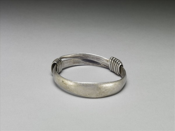 銀銅合金手鐲,全器由一扁平金屬條彎繞成一圓環,兩端漸細,末端皆成為迴旋纏繞之金屬圈,可調整手鐲大小並兼具裝飾功能,內側有刻款,漫漶不清。