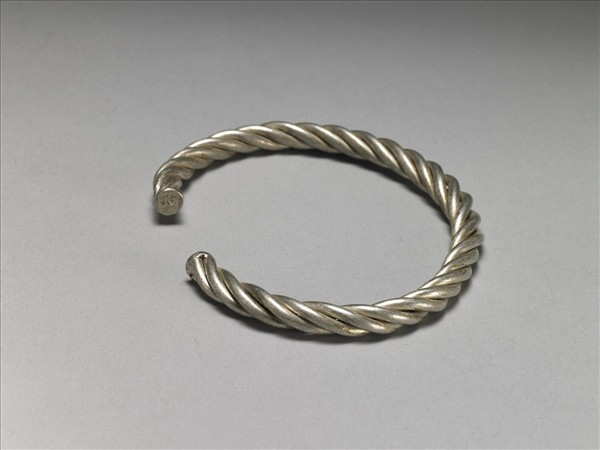 銀銅合金手鐲,全器由三條金屬條交錯纏繞成絞絲紋,並呈一圓環形狀,帶缺口以供手腕穿戴,缺口端有刻款,漫漶不清。