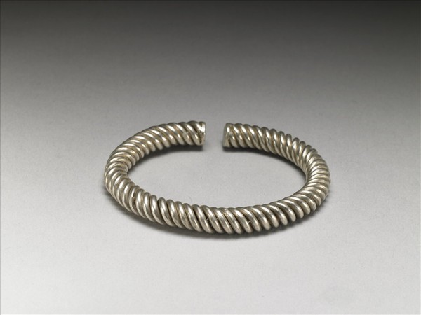 銀銅合金手鐲,全器由金屬條纏繞成絞絲紋,並呈一圓環形狀,帶缺口以供手腕穿戴。
