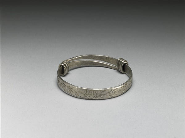 銀銅合金手鐲,整器由兩端較細的金屬片製作而成,外壁花葉紋。金屬片兩端急收,末端拗彎為圓,皆分別反折旋繞於器身,可作為配戴時固定、調整環徑之用。