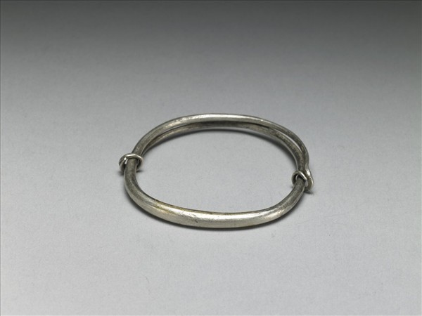 銀銅合金手鐲,整器由兩端較細的金屬條製作而成,外壁光素無紋。兩端拗彎為圓,分別鉤搭器身,可作為配戴時固定、調整環徑之用。
