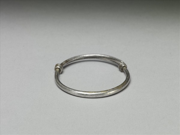 銀銅合金手鐲,整器由兩端較細的金屬條製作而成,外壁光素無紋。兩端拗彎為圓,分別反折旋繞於器身,可作為配戴時固定、調整環徑之用。