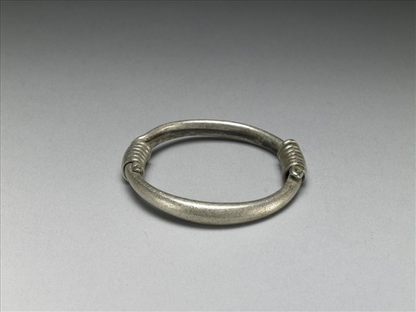 銀銅合金手鐲,整器由兩端較細的金屬條製作而成,外壁光素無紋。兩端拗彎為圓,分別反折旋繞於器身,可作為配戴時固定、調整環徑之用。