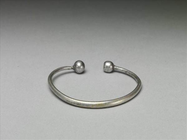 銀銅合金手鐲,整器由金屬條製作而成,中段粗而兩端細,外壁光素無紋,末端端點各銲連一金屬圓球。金屬條拗彎為環形,帶缺口以利穿戴。