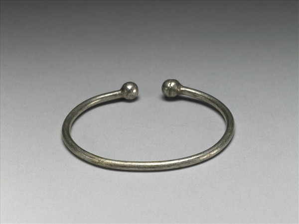 銀銅合金手鐲,整器由金屬條製作而成,中段粗而兩端細,外壁光素無紋,末端端點各銲連一金屬圓球。金屬條拗彎為環形,帶缺口以利穿戴。