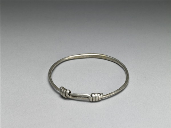 銀銅合金手鐲,整器由兩端較細的金屬條製作而成,外壁光素無紋。兩端拗彎為圓,分別反折旋繞於器身,可作為配戴時固定、調整環徑之用。