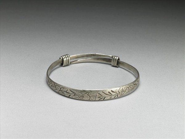 銀銅合金手鐲,整器由兩端較細的金屬片製作而成,外壁轉枝花葉,花葉間一鳥張翅回首,內壁見有印記,印記漫漶不清。金屬片兩端急收,末端拗彎為圓,皆分別反折旋繞於器身,可作為配戴時固定、調整環徑之用。