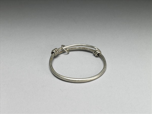 銀銅合金手鐲,整器由兩端較細的金屬條製作而成,外壁光素無紋,器身上有金屬環。兩端拗彎為圓,分別反折旋繞於器身,可作為配戴時固定、調整環徑之用。