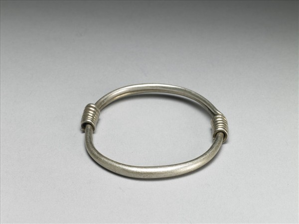 銀銅合金手鐲,整器由兩端較細的金屬條製作而成,外壁光素無紋。兩端拗彎為圓,分別反折旋繞於器身,可作為配戴時固定、調整環徑之用。