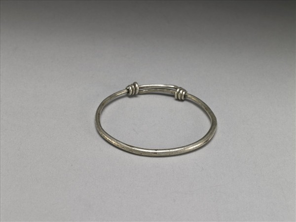 銀銅合金手鐲,整器由兩端較細的金屬條製作而成,外壁光素無紋。兩端拗彎為圓,分別反折旋繞於器身,可作為配戴時固定、調整環徑之用。