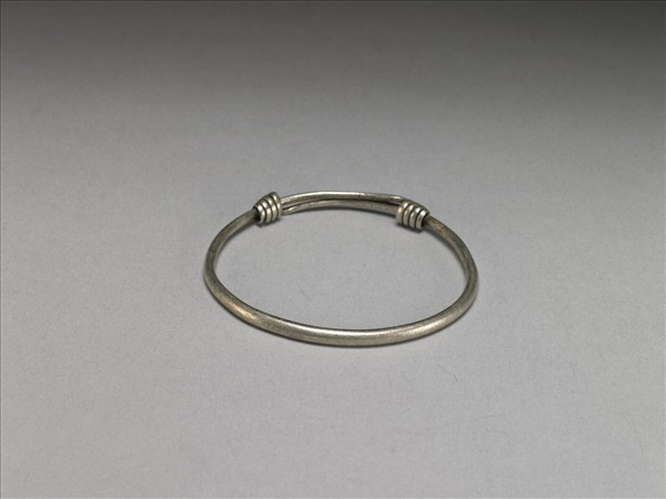 銀銅合金手鐲,整器由兩端較細的金屬條製作而成,外壁光素無紋。兩端拗彎為圓,分別反折旋繞於器身,可作為配戴時固定、調整環徑之用。