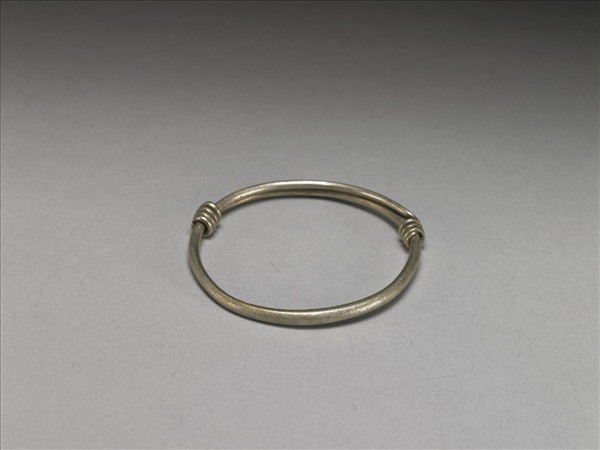 銀銅合金手鐲,整器由兩端較細的金屬條製作而成,外壁光素無紋。兩端拗彎為圓,分別反折旋繞於器身,可作為配戴時固定、調整環徑之用。