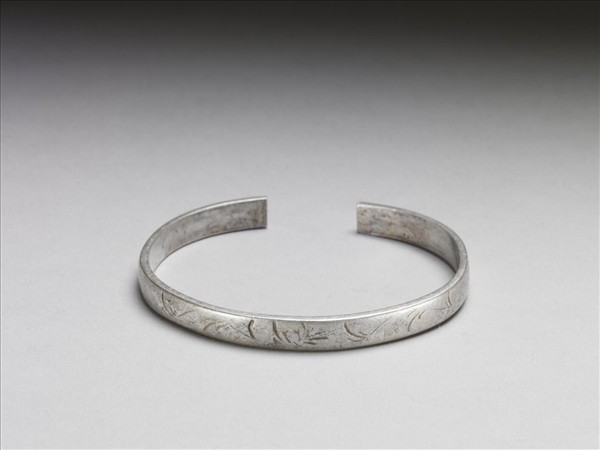 銀銅合金手鐲,整器由金屬片製作而成,外壁花葉紋,器內壁有印記,但已漫漶不清。金屬片拗彎為環形,帶缺口以利穿戴。