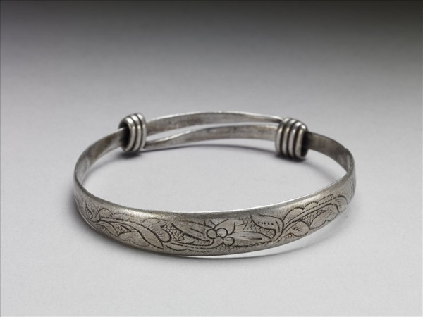 銀銅合金手鐲,全器由一扁平金屬條彎繞成一圓環,兩端漸細,末端皆成為迴旋纏繞之金屬圈,可調整手鐲大小並兼具裝飾功能。手鐲正面陰刻花葉紋,其間綴以半圓形錦地。