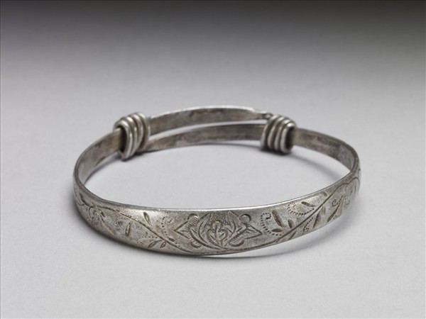 銀銅合金手鐲,全器由一扁平金屬條彎繞成一圓環,兩端漸細,末端皆成為迴旋纏繞之金屬圈,可調整手鐲大小並兼具裝飾功能。手鐲正面中央陰刻花葉紋,兩末端光素無紋。