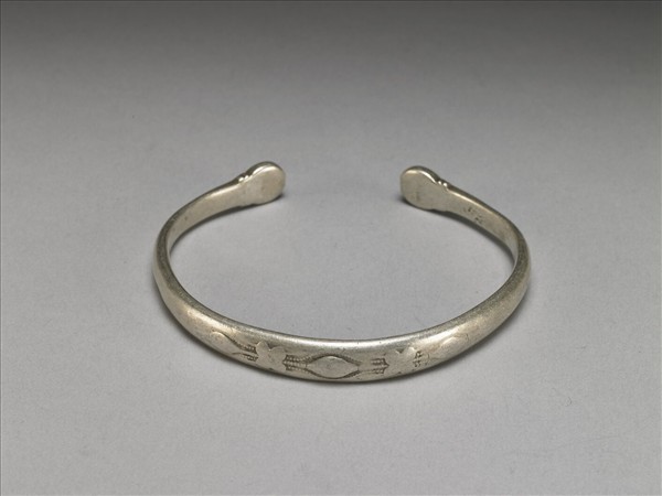 銀銅合金手鐲,全器由一粗細均勻之金屬條彎繞成一圓環,帶缺口以供手腕穿戴,兩末端呈隆起半球形。手鐲正面飾四瓣花與橢圓圖紋,其間綴以魚子紋。手鐲背面中央帶三長方框,分別為「民產」、「金店」及「紋銀」印。