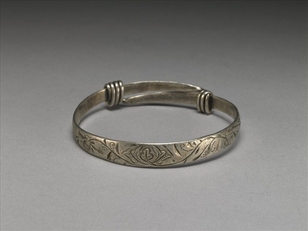 銀銅合金手鐲,全器由一扁平金屬條彎繞成一圓環,兩端漸細,末端皆成為迴旋纏繞之金屬圈,可調整手鐲大小並兼具裝飾功能。手鐲正面陰刻花葉紋,內側帶兩長方框印記,皆漫漶不清。
