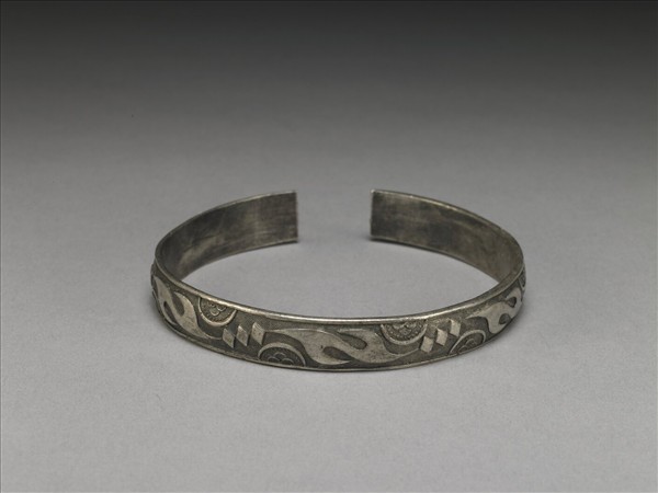 銀銅合金手鐲,全器由一粗細均勻之扁平金屬條彎繞成一圓環,帶缺口以供手腕穿戴,兩端缺口處平整。手鐲正面以淺粟米銀珠為地紋,上飾菱形與幾何紋交錯之帶紋,邊緣飾多組大小半圓紋組成之圖案。手鐲背面中央帶一長方框「瑞寶」印記。
