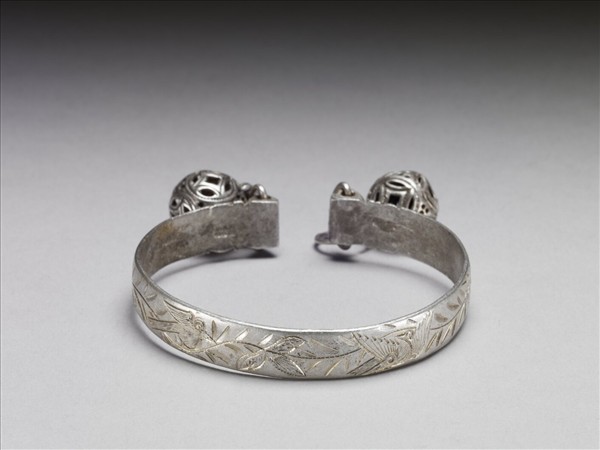 銀銅合金手鐲,全器由一粗細均勻之扁平金屬條彎繞成一圓環,帶缺口以供手腕穿戴,兩端缺口處平整。手鐲正面淺刻捲曲翻轉花葉紋,並有兩鳥穿梭飛翔於其間。手鐲兩末端各綴有一鏤雕圓球。