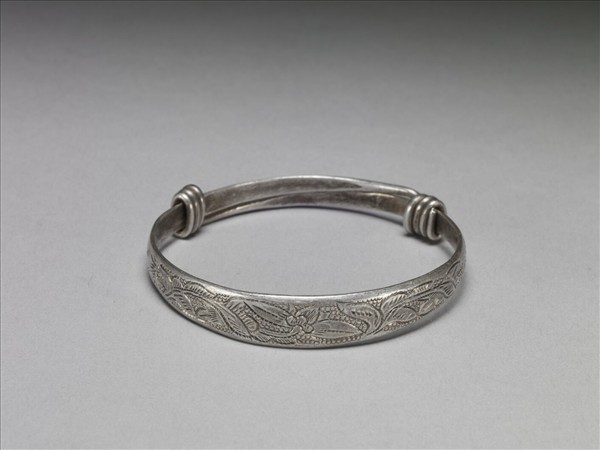 銀銅合金手鐲,全器由一扁平金屬條彎繞成一圓環,兩端漸細,末端皆成為迴旋纏繞之金屬圈,可調整手鐲大小並兼具裝飾功能。手鐲正面中央以圓形為錦地,淺刻捲曲翻轉花葉紋,兩末端以多道短線組成連續V字形紋。