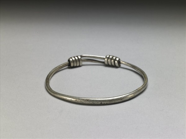 銀銅合金手鐲,全器由一細金屬條彎繞成一圓環,兩端漸細,末端皆成為迴旋纏繞之金屬圈,可調整手鐲大小並兼具裝飾功能。手鐲光素無紋。