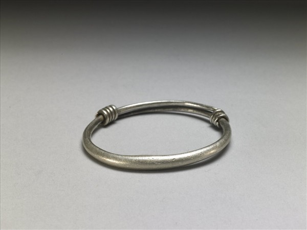 銀銅合金手鐲,全器由一細金屬條彎繞成一圓環,兩端漸細,末端皆成為迴旋纏繞之金屬圈,可調整手鐲大小並兼具裝飾功能。手鐲光素無紋。