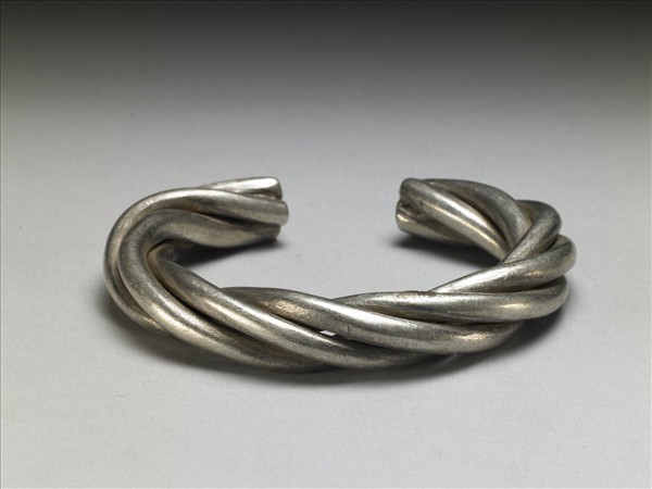 銀銅合金手鐲,全器由四金屬條旋繞成緊密相連之螺旋紋,並呈一圓環形狀,帶缺口以供手腕穿戴。兩端缺口處平整。