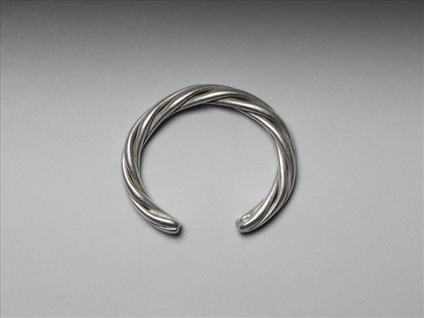銀銅合金手鐲,全器由四粗金屬條交錯纏繞成絞絲紋,並呈一圓環形狀,帶缺口以供手腕穿戴。