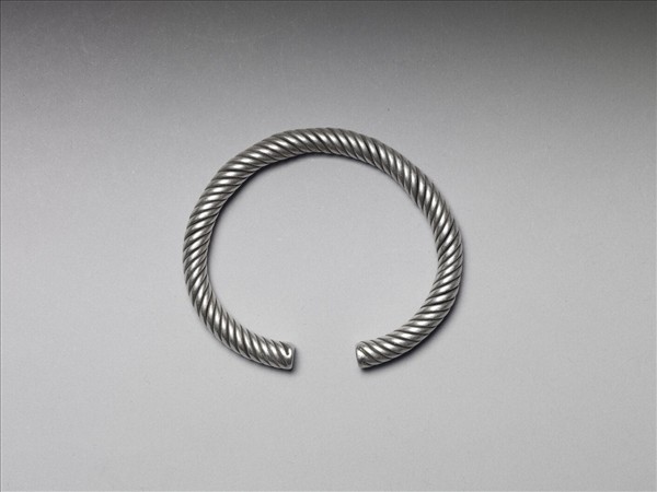 銀銅合金手鐲,全器由金屬條旋繞成緊密之螺旋紋,並呈一圓環形狀,帶缺口以供手腕穿戴,兩端缺口齊整。