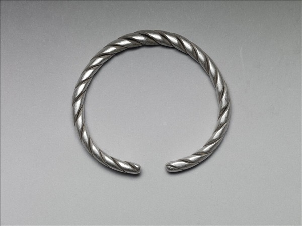 銀銅合金手鐲,全器由三金屬條旋繞成緊密相連之螺旋紋,並呈一圓環形狀,帶缺口以供手腕穿戴。